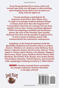 Symphony of the Damned summons forth the ghoulishly diabolical talents of authors Adam C. Mitchell, A.E. Jackson, Andy Holberry, Buck Hanno, Catherine Jordan, David Lowrie, Debra J. Tillar, James A. Hirons, James Mascia, Luis Medina, Margaret McGoverne, Marie Lanza, Matthew Hollis Damon, Matt Martinek, Pat O’Neill, R.M. Breslin, Sara Jordan-Heintz, TroyAnthony Schermer, Victoria Hancox, and concludes with a grippingly terrifying novella by J. Miles Parker.