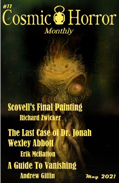 The May 2021 Issue #11 of Cosmic Horror Monthly features a painter looking for inspiration in the most hellish of places in Scovell’s Final Painting. Then, a recovering alcoholic doctor aids in the final wishes of an old woman who seeks immortality no matter the cost in The Last Case of Dr. Jonah Wexley Abbott.